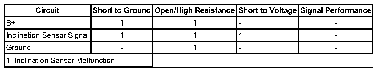 • If not the specified value, test the signal circuit for a short to ground or and open/high resistance. If the circuit tests normal, test or replace the inclination sensor.