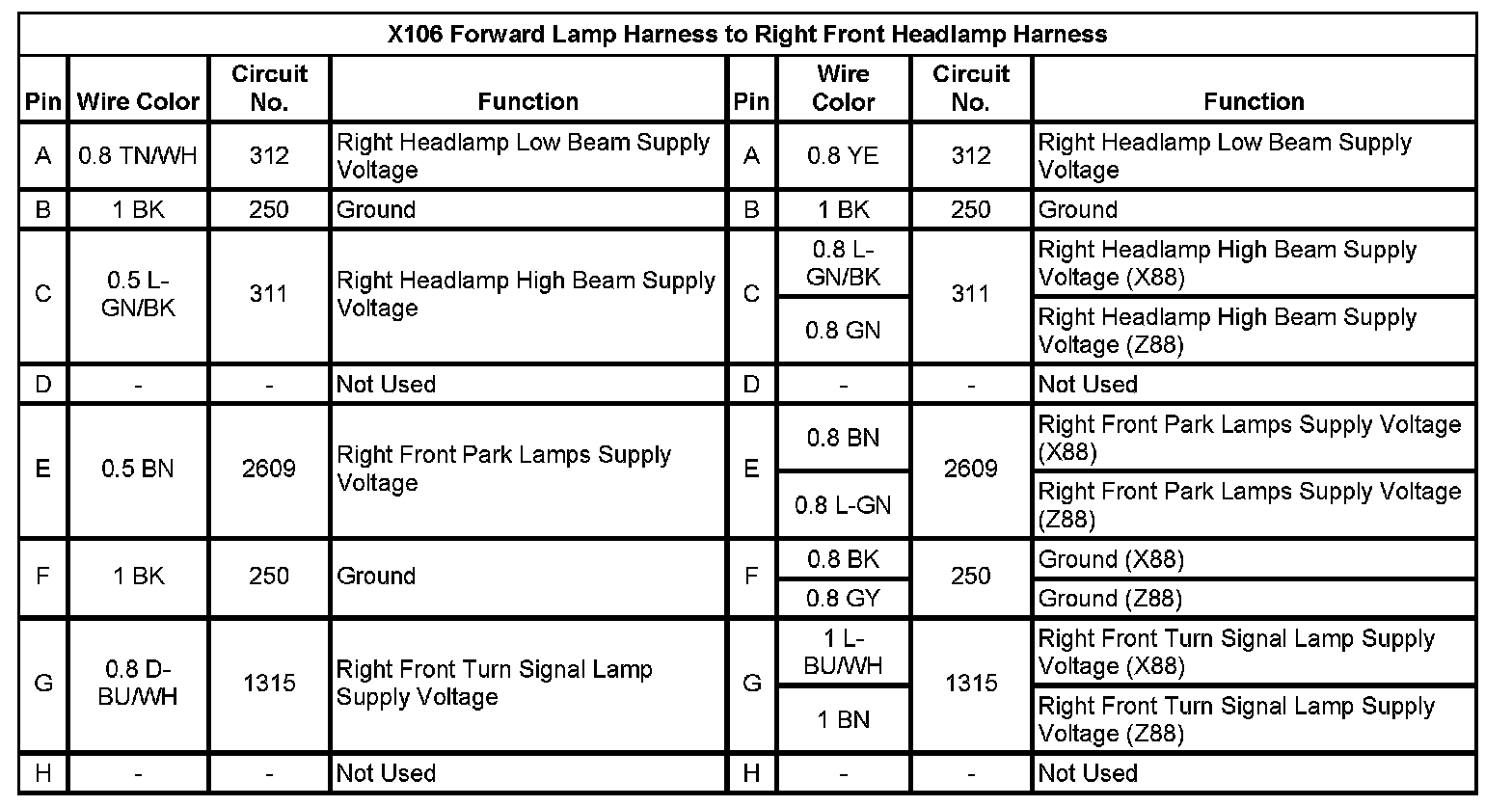 X106 Forward Lamp Harness to Right Front Headlamp Harness
