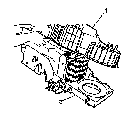 6. Separate the upper HVAC module assembly (2) from the lower HVAC module assembly (1)