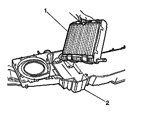 1. Install the evaporator core (1) to the HVAC module assembly (2).