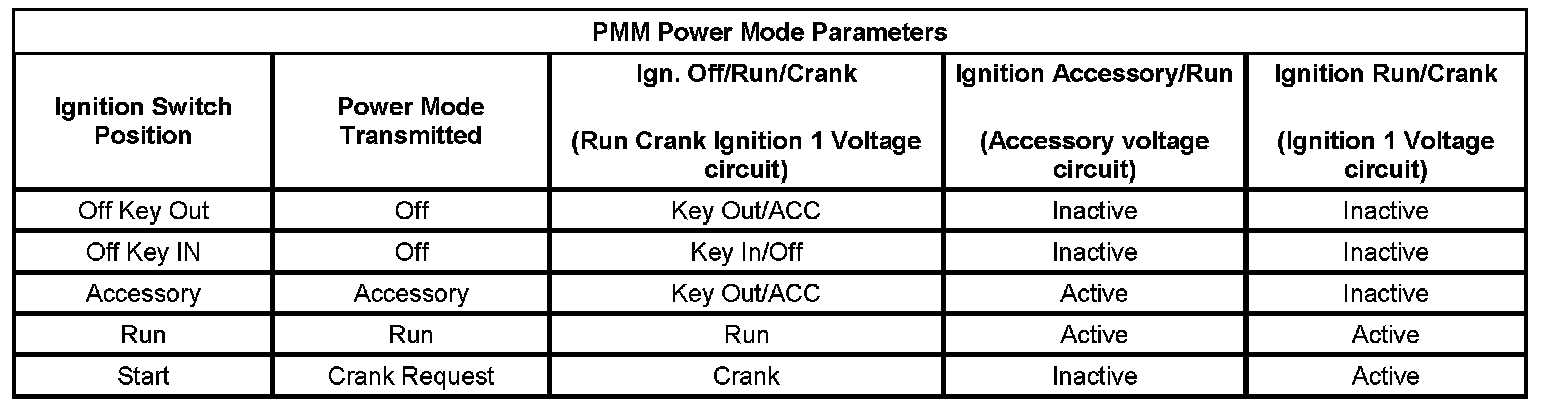 The PMM receives ignition switch signals to identify the operators desired power mode. The PMM Power Mode Parameters table below illustrates the correct state of these input parameters (circuits) in correspondence to the ignition switch position: