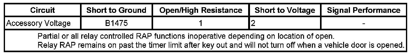 The retained accessory power (RAP) system allows specific vehicle functions to operate after the ignition is turned OFF for a predetermined time. The RAP relay is internal to the BCM. Relay RAP is controlled by the BCM using inputs from the door ajar switches to determine control of the relay when the ignition is turned OFF. Radio RAP is controlled by a serial data message from the BCM using inputs from the driver door open switch. Refer to Retained Accessory Power (RAP) Description and Operation for more detail on RAP operation.