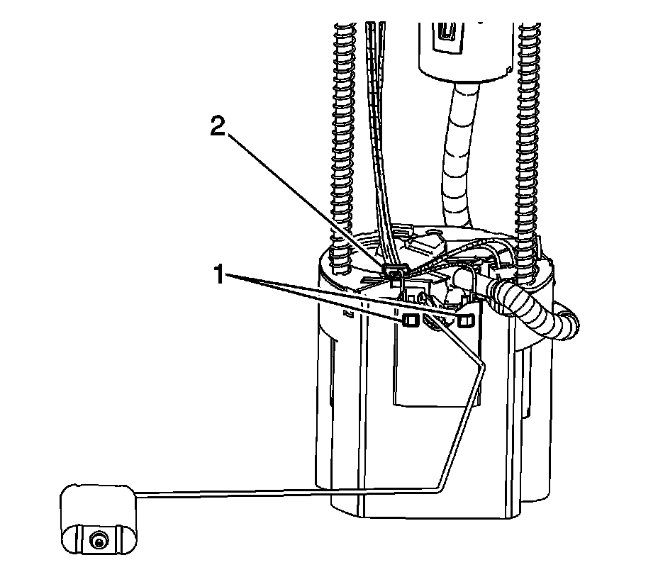3. Install the fuel level sensor wiring pigtail under the module clip (2) behind the fuel pump wires.