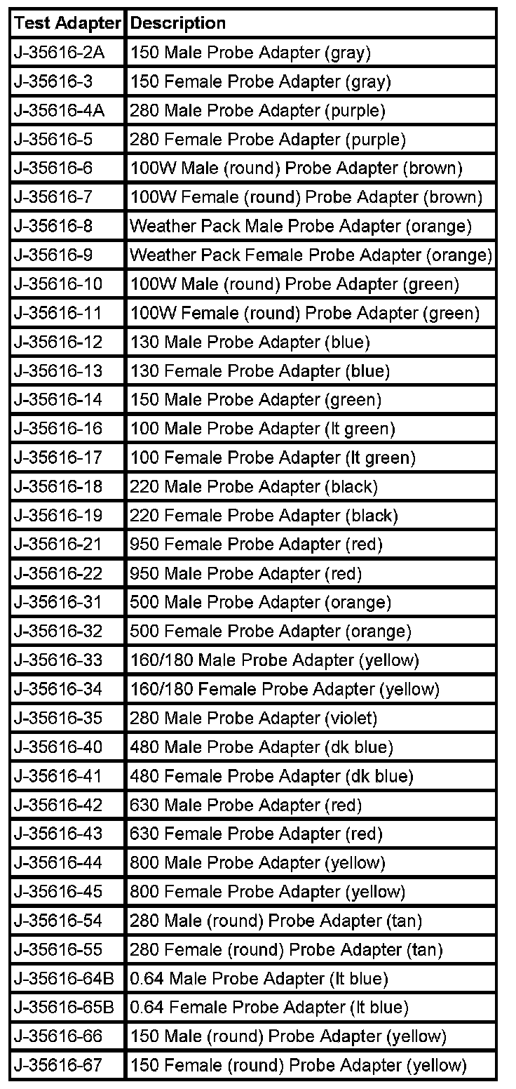 Notice: Do not insert test equipment probes (DVOM etc.) into any connector or fuse block terminal. The diameter of the test probes will deform most terminals. A deformed terminal will cause a poor connection, which will result in a system failure. Always use the J-35616 GM-Approved Terminal Test Kit in order to front probe terminals. Do not use paper clips or other substitutes to probe terminals.