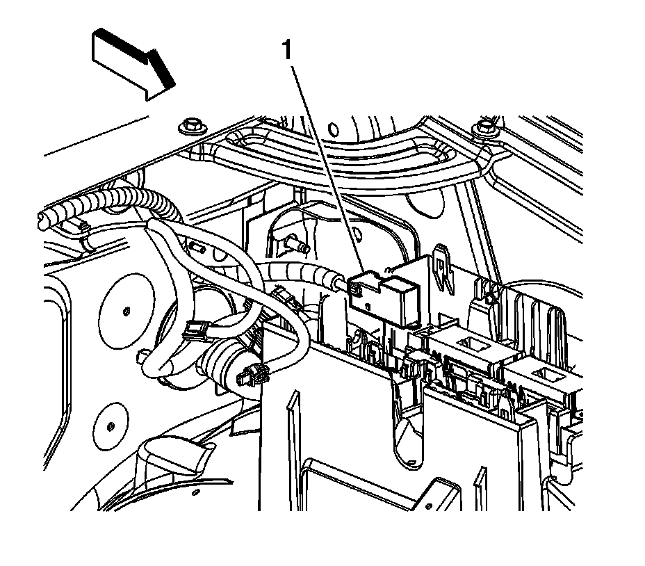 5. Remove the positive battery cable connector (1) from the underhood bussed electrical center (UBEC).