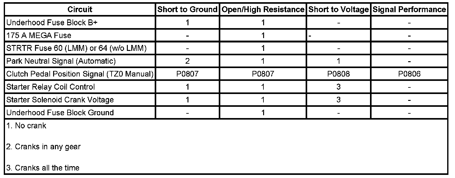 • If the test lamp is always OFF, test the relay coil control circuit for a short to ground or and open/high resistance. Inspect the STRTR fuse for an open. If the STRTR fuse is open, test the relay controlled output circuit for a short to ground, or replace the starter solenoid (LMM) or starter. If the circuit and fuse test normal, replace the ECM.