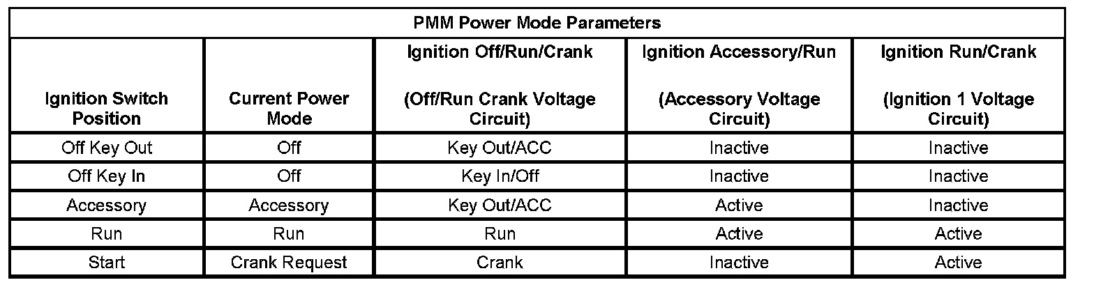 Verify that all the parameters listed in the following table correspond to the ignition key position. The PMM Power Mode parameters table below illustrates the correct state of these parameters (circuits) with the corresponding ignition switch positions. The circuits related to the parameters are in parenthesis.