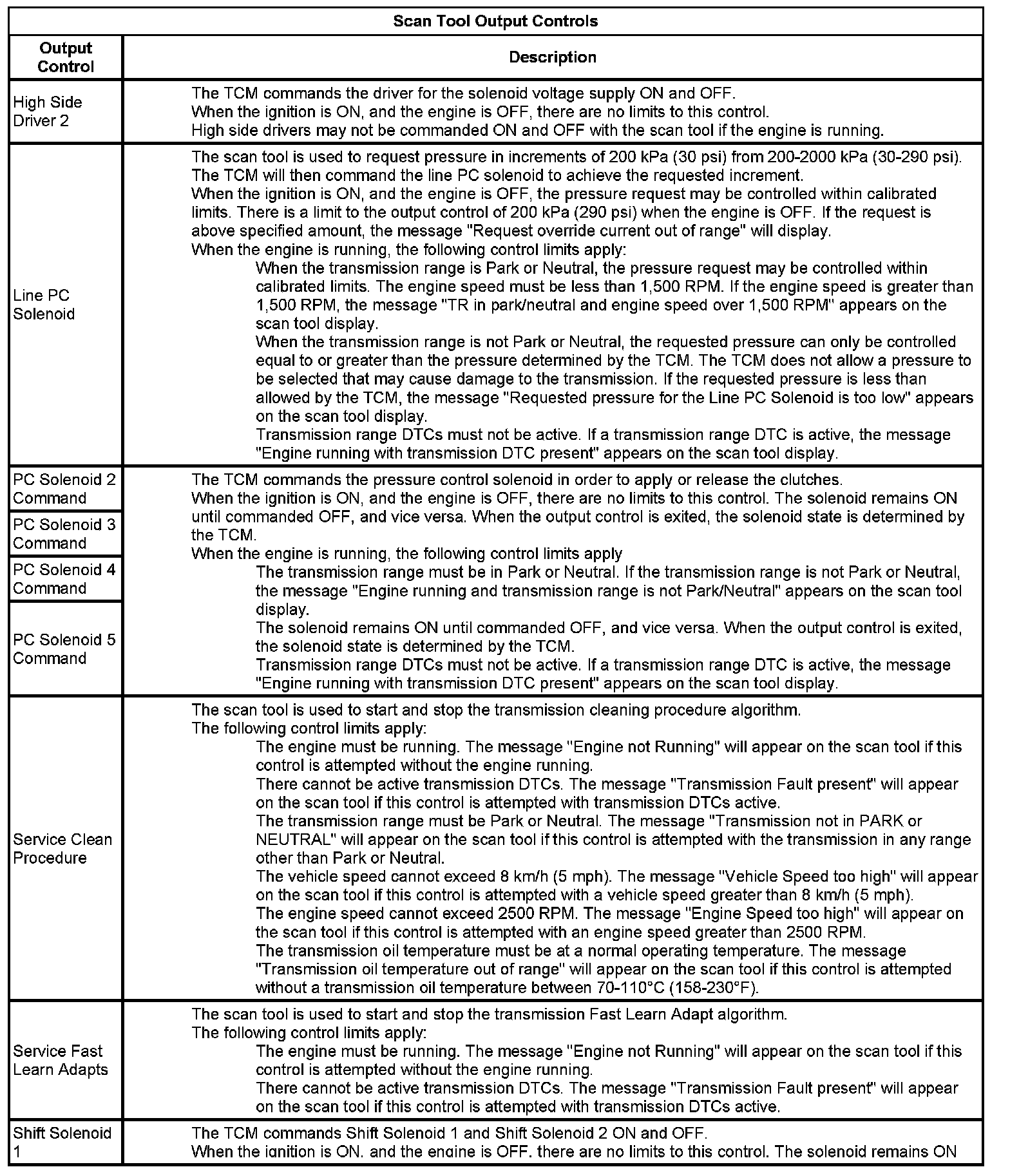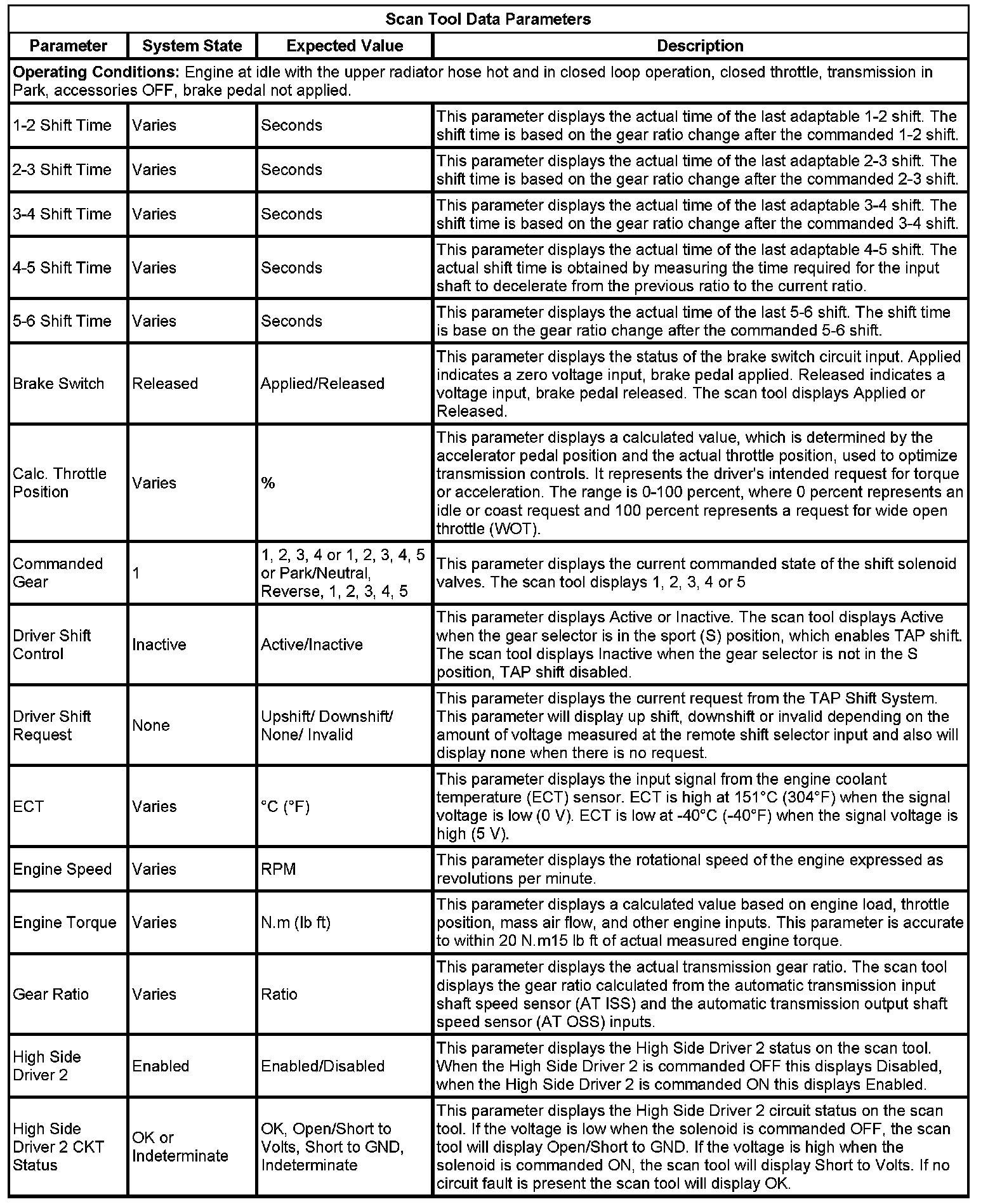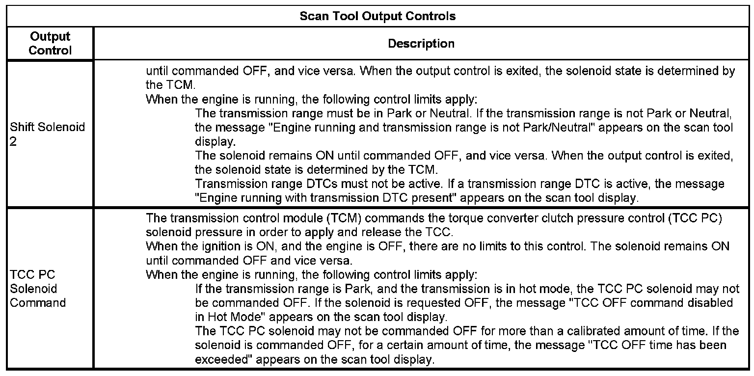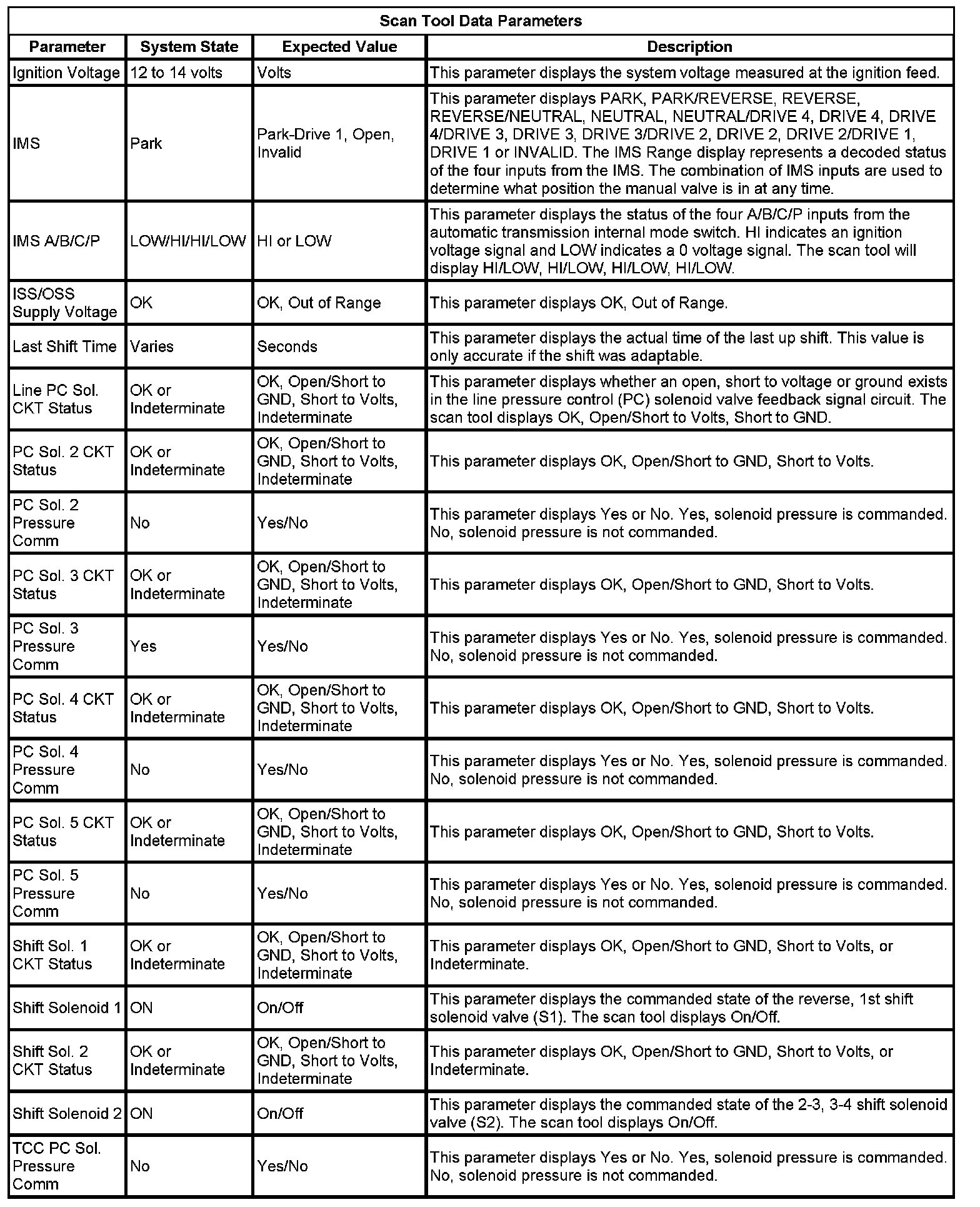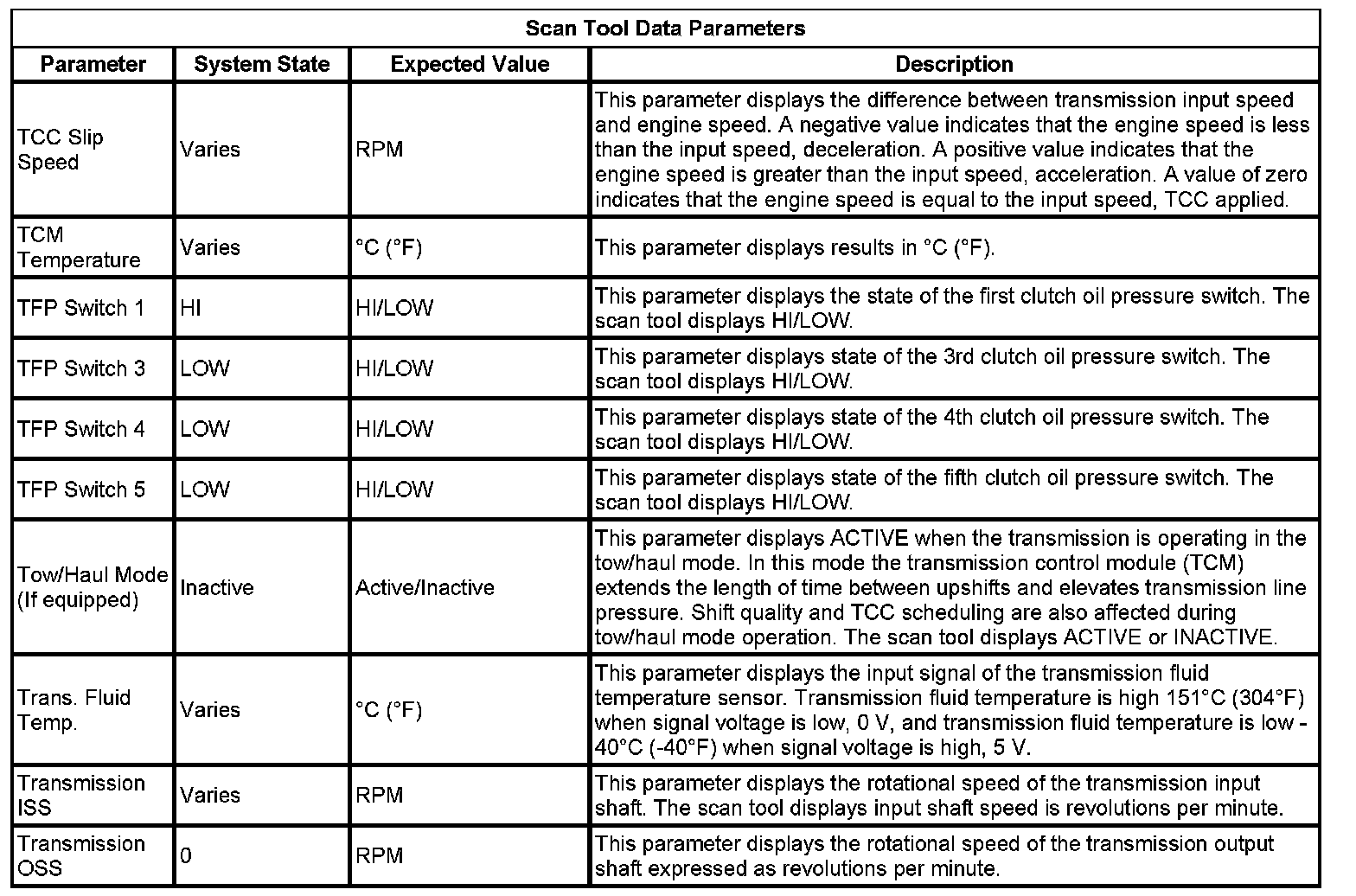 The Transmission Control Module Scan Tool Data List contains all transmission related parameters that are available on the scan tool. The list is arranged in alphabetical order. A given parameter may appear in any one of the data lists, and in some cases may appear more than once, or in more than one data list in order to group certain related parameters together.