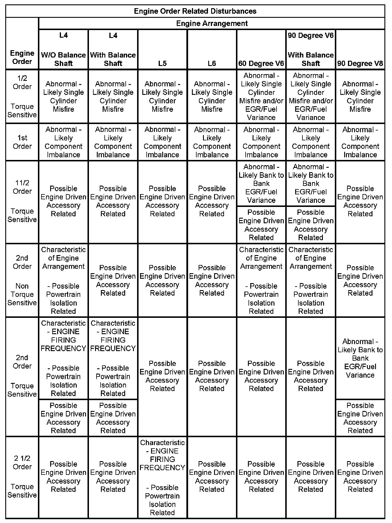 3. If the dominant frequency in Hz, recorded during duplication of the disturbance and the engine firing frequency in Hz, just calculated ARE related, then an engine FIRING FREQUENCY related disturbance is present. Engine firing frequency disturbances are usually related to improper isolation of a component. Refer to the Engine Order Related Disturbances table.