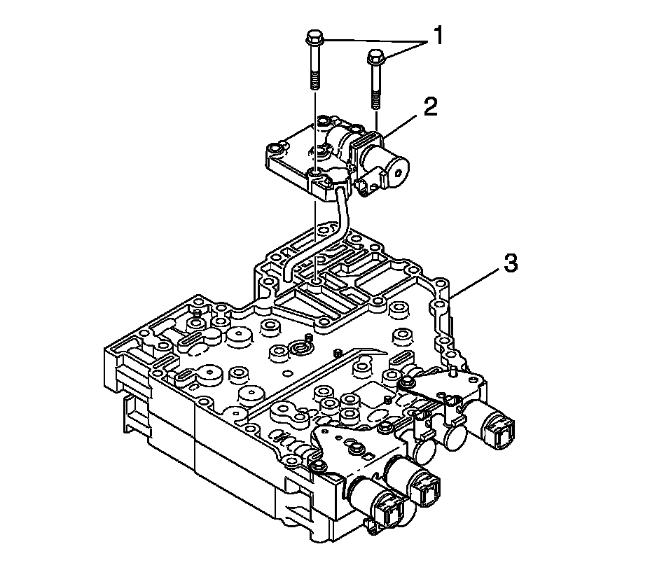 6. Remove 2 bolts (1) retaining the modulated main pressure solenoid valve body to the main valve body (3).