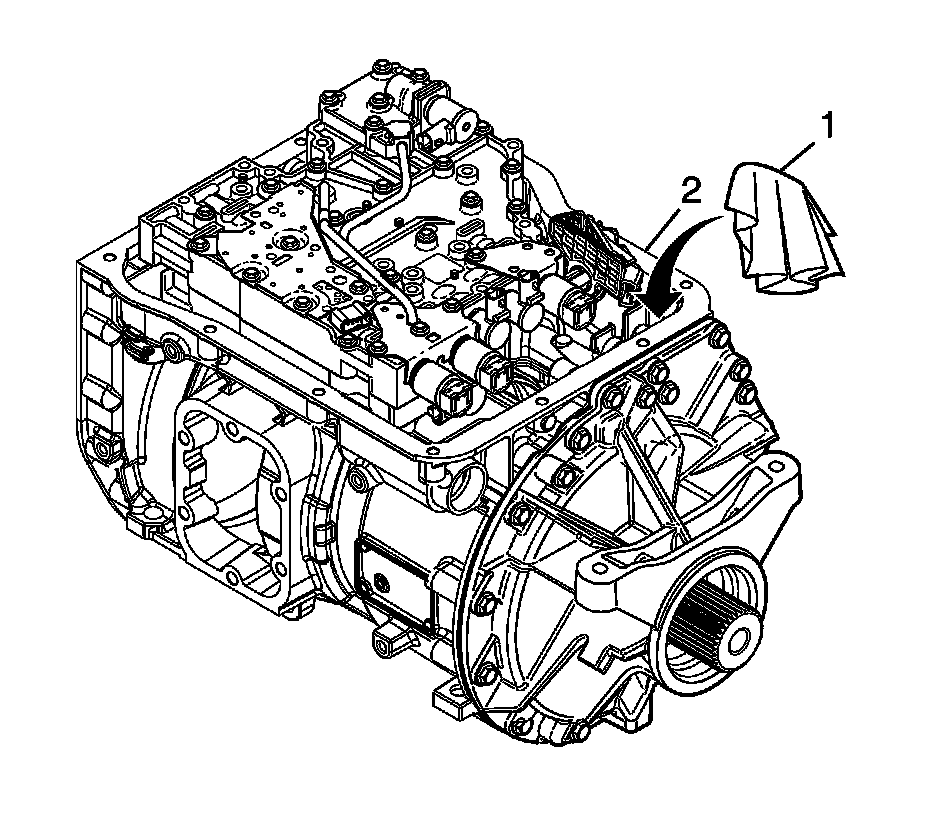 5. Install a lint-free cloth (1) in the park pawl apply assembly guide hole in the transmission case (2).