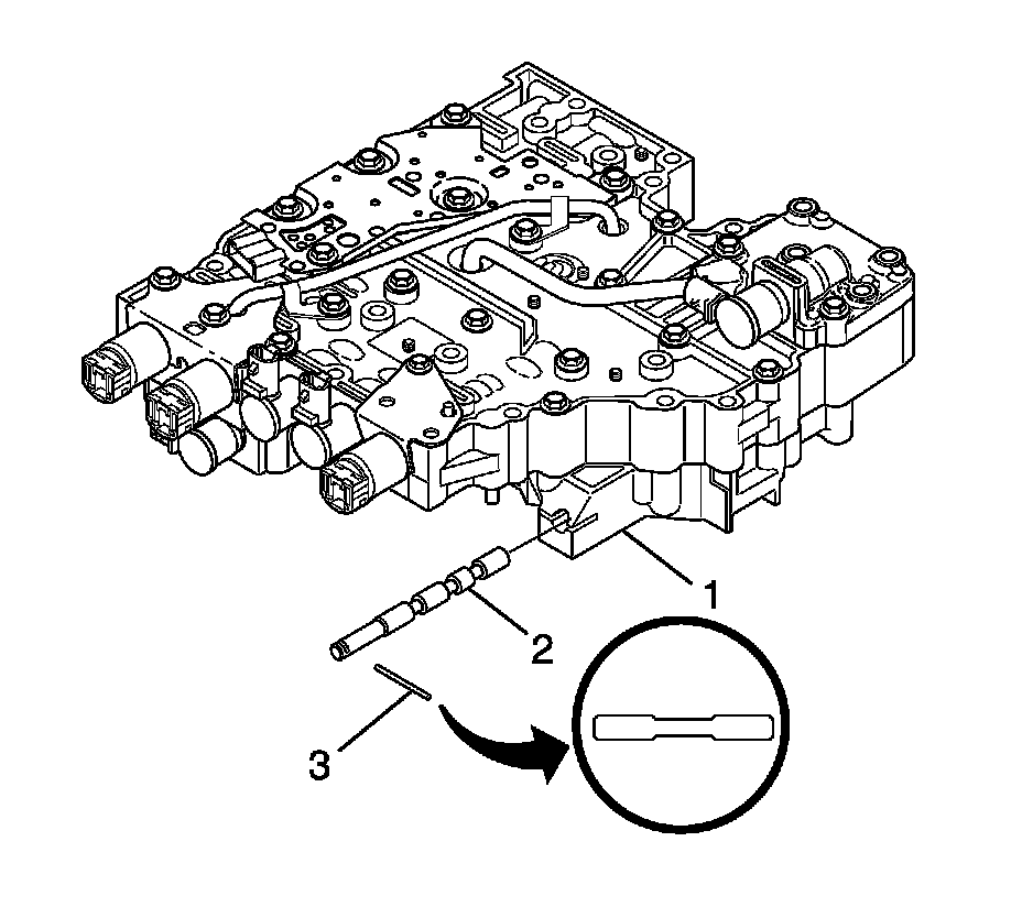 9. Remove, as a unit, the manual valve (2) and the manual valve pin (3) from the shift valve body assembly (1).