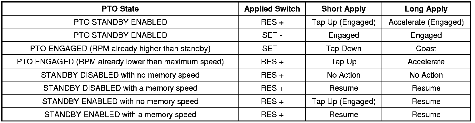 Preset PTO can only be used when the vehicle is not moving. The engine speed is initially set to a standby engine speed of 800 RPM. This provides an initial start-up engine speed to match the engagement of the PTO load. The PTO standby engine speed can be reprogrammed to higher speeds.