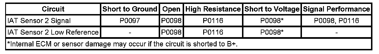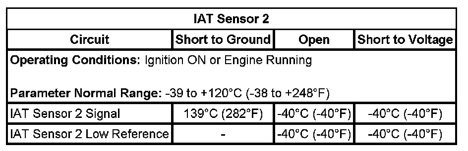 The IAT sensor 2 is greater than 148°C (298°F) for greater than 1 second. This is equal to or less than 0.10 volt on the IAT sensor 2 signal circuit as measured by the ECM.