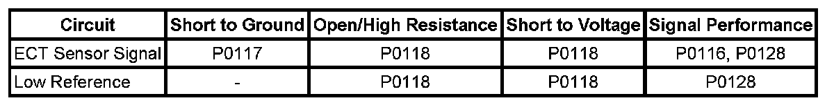 An ECT sensor signal circuit or low reference circuit that is shorted to another 5-voltreference circuit can cause a DTC P0118 to set.