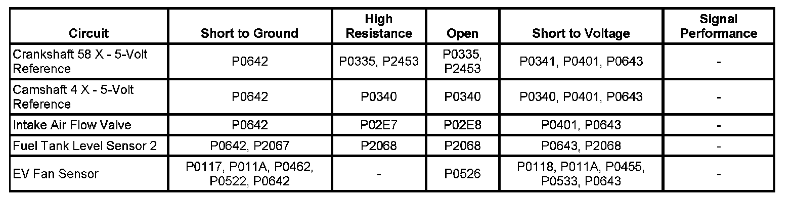 The engine control module (ECM) supplies 5 volts to components through 5-volt reference circuits. These 5-volt reference circuits are independent of each other outside the ECM, but are bussed together in three reference groups inside the ECM. Therefore, a circuit condition on one sensor 5-volt reference circuit may affect multiple components. The ECM monitors voltage on the 5-volt reference circuits.