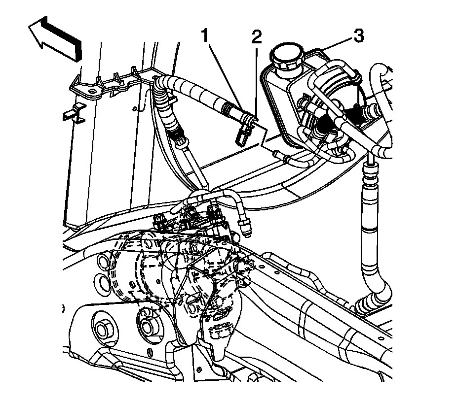 4. Disconnect the power steering gear outlet hose (1) from the power steering pump assembly (3).