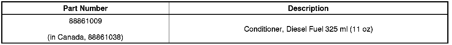 The other method of coping with water in the fuel is through emulsification. This method, often using alcohol as the emulsifier, keeps water particles suspended in the fuel. Emulsification of water in the fuel can allow water to get past the fuel filter/water separator, in most cases causing damage to the fuel system. Only alcohol free water demulsifiers should be used in General Motors diesel engines. GM Diesel Fuel Conditioner(R), P/N 88861009 (in Canada, 88861038) is alcohol free and utilizes water demulsifiers to cope with water in the fuel. Other brands may be available in different areas; be sure that they clearly state that they are alcohol free demulsifiers before use.