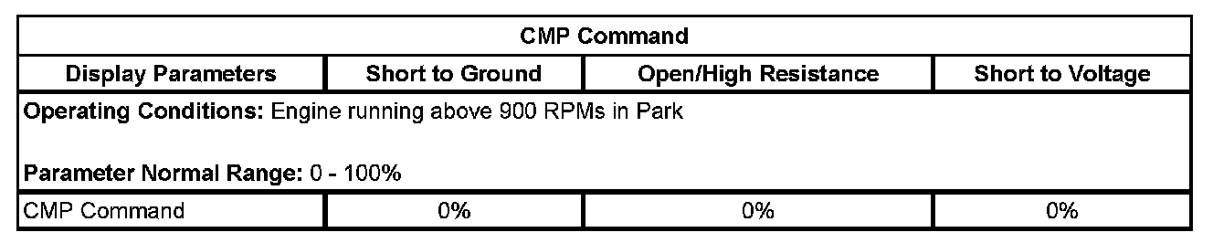 The ECM detects that the state of the high side driver and the state of the CMP solenoid control circuit does not match. The ECM will detect an open, high resistance, short to ground, or a short to voltage on the CMP solenoid control circuit, or an open on the low reference circuit, if the condition is present for more than 6 seconds.