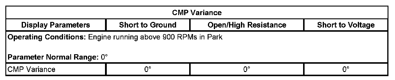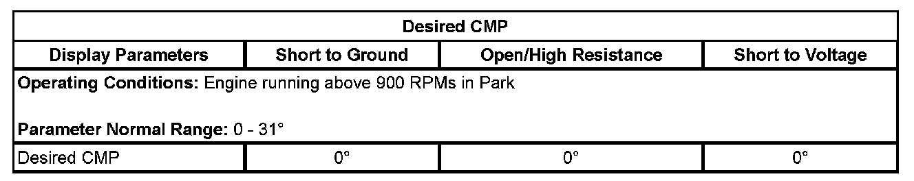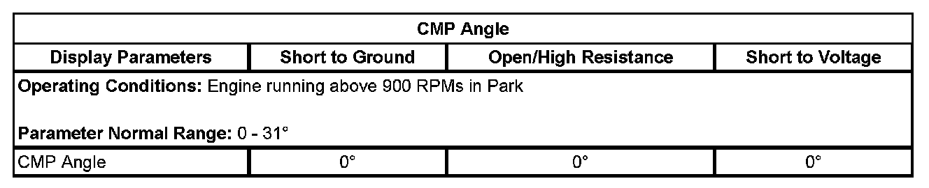 7. Command the CMP actuator from 0-25 degrees. Verify the scan tool CMP actuator ckt short to volts test status parameter is OK.