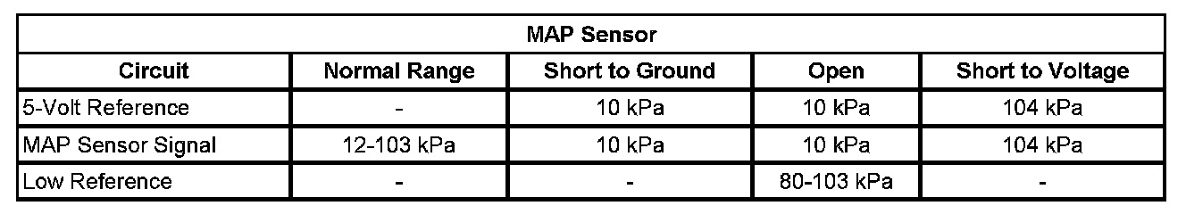 Under normal operation the highest pressure that can exist in the intake manifold is equal to BARO. This occurs when the vehicle is operated at wide-open throttle (WOT) or when the ignition is on while the engine is off. Under these conditions, the ECM uses the MAP sensor to determine the current BARO. The lowest manifold pressures occur when the vehicle is idling or decelerating. MAP can range from 10 kPa, when pressures are low, to as much as 104 kPa when pressures are high, depending on the BARO. The ECM monitors the MAP sensor signal for pressure outside of the normal range.