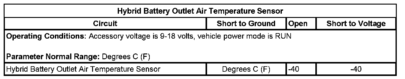 * Circuit Performance outlet - The hybrid battery cooling fan is ON and outlet air temperature is greater than maximum battery temperature by 10°C (50°F) for 9 out of 10 seconds.