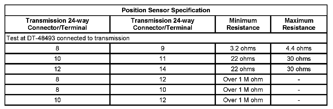 3. Test the circuits in the Position Sensor Specification table as indicated below. Also test these circuits for short to ground.