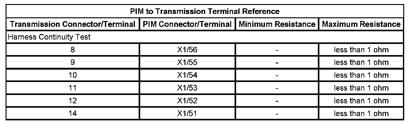 7. Test the circuits in the PIM to Transmission Terminal Reference table as indicated below. Also test these circuits for short to ground and the shield circuit if not presently grounded to the PIM assembly.