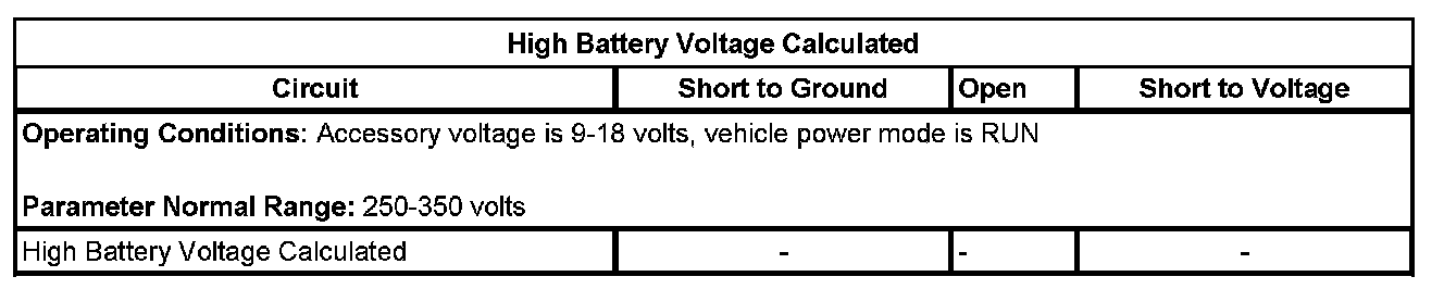 The battery energy control module (BECM) monitors the voltage values of the hybrid batteries in more than one method. The BECM monitors the calculated battery voltage (sum of the voltages from the 20 individual battery measurements) and the terminal voltage (total bus voltage measured on the output side of the high voltage relay contactors). When the BECM detects that the calculated battery voltage measurement is out of a specified range these DTCs will set.