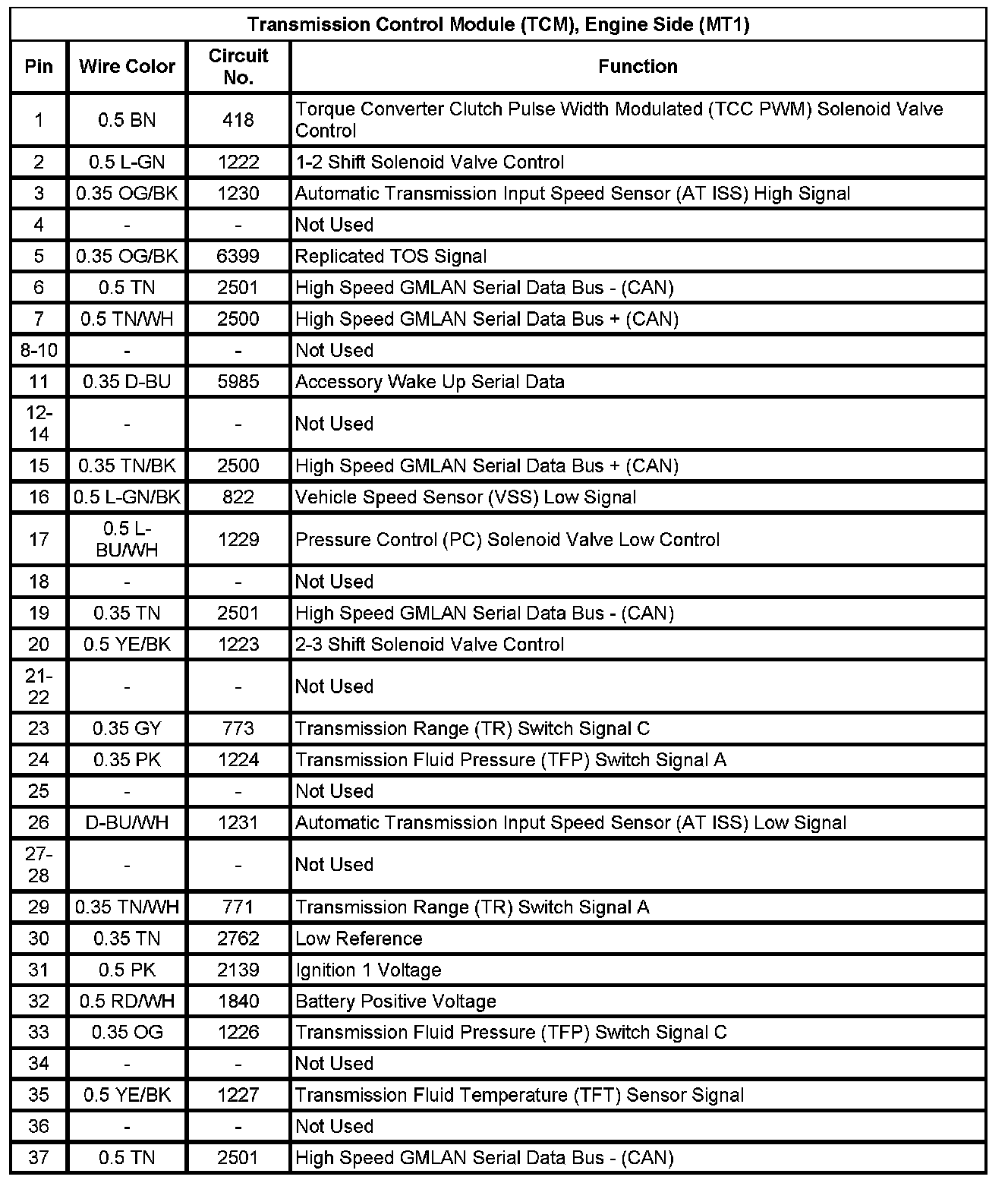 Transmission Control Module (TCM)(M30/M70) (Pin 1 To 37):