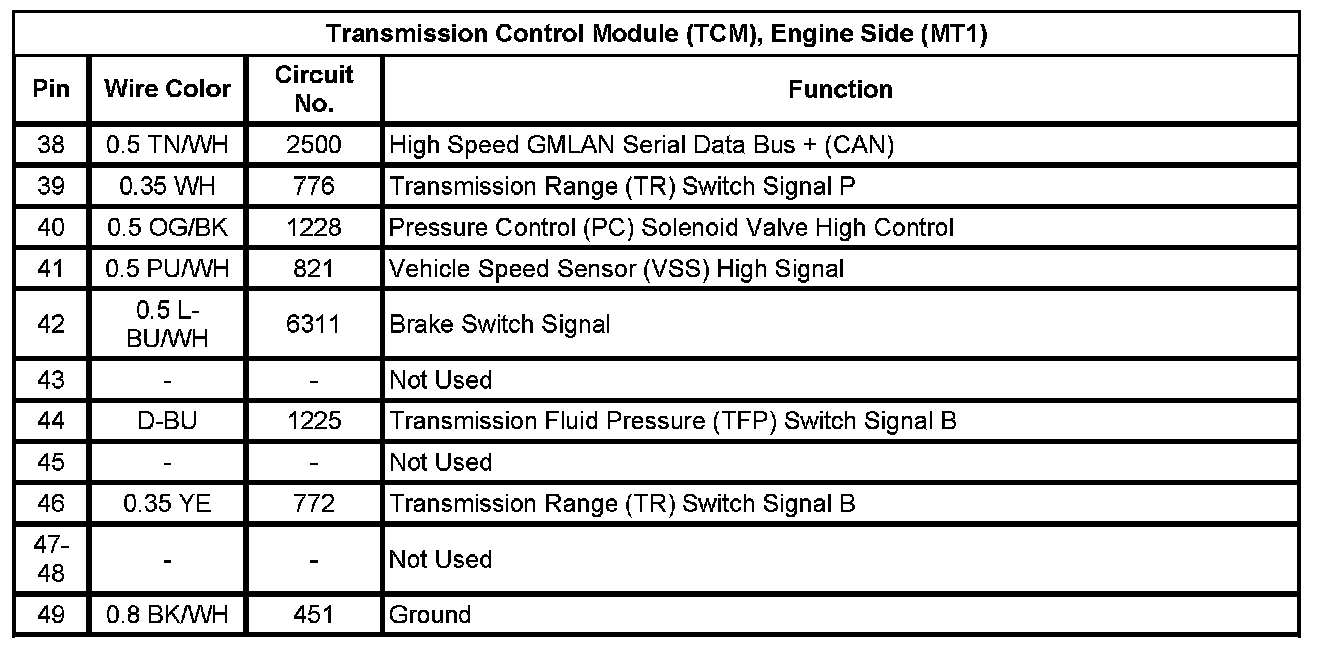 Transmission Control Module (TCM)(M30/M70) (Pin 38 To 49):