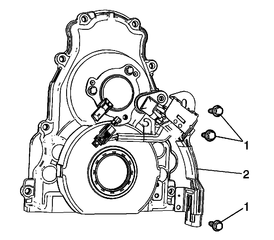 7. Position the CMP sensor wire harness (2) to the front cover.
