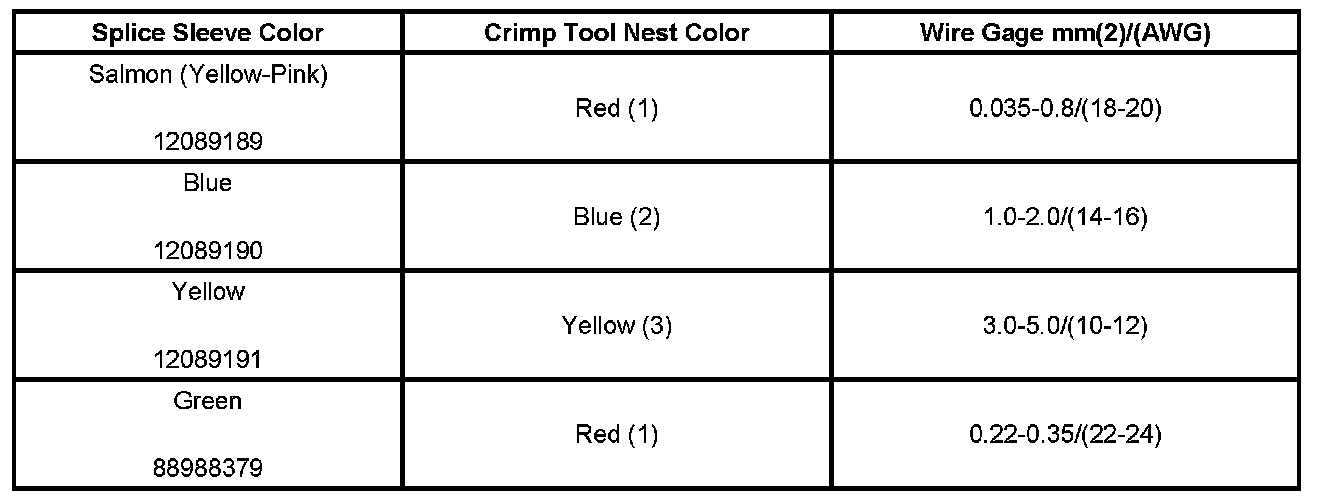 4. Select the proper DuraSeal splice sleeve according to the wire size. Refer to the above table at the beginning of the repair procedure for the color coding of the DuraSeal splice sleeves and the crimp tool nests.