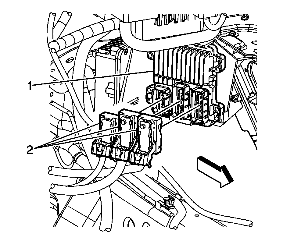 3. Position the engine wiring harness electrical connectors and engage the retainers securing the connectors (2) to the ECM (1).