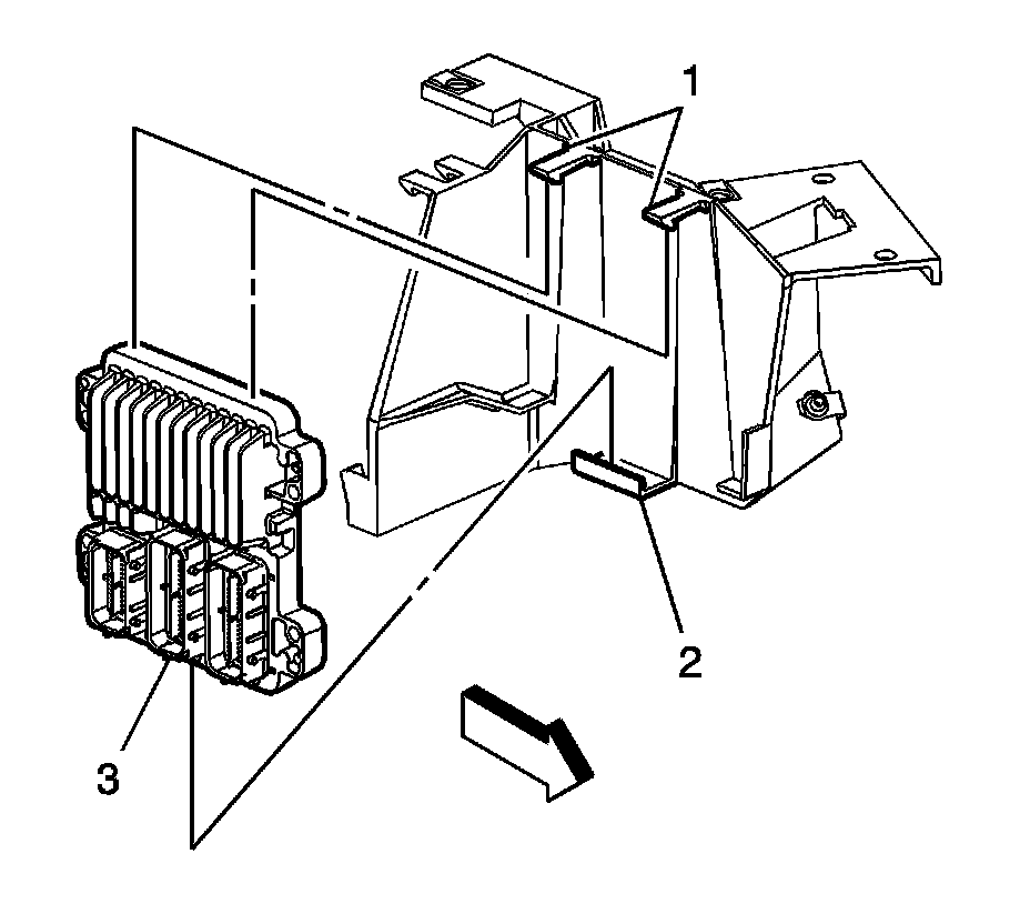 1. Set the bottom of ECM into the ECM bracket tab (2).