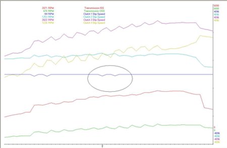 To verify the concern is caused by the orifice, monitor the Hybrid Low 1-2 clutch slip speed (clutch 1 on the scan tool). Normal clutch slip speed should be 0 rpm. If the slip speed varies either positive or negative slip rpm, or causes other clutch slip speeds to read erratic, the orifice is most likely restricted (see scan tool screen shot below showing variation of the clutch 1 slip speed (circled area). Normal reading would have a flat line (0 rpm).