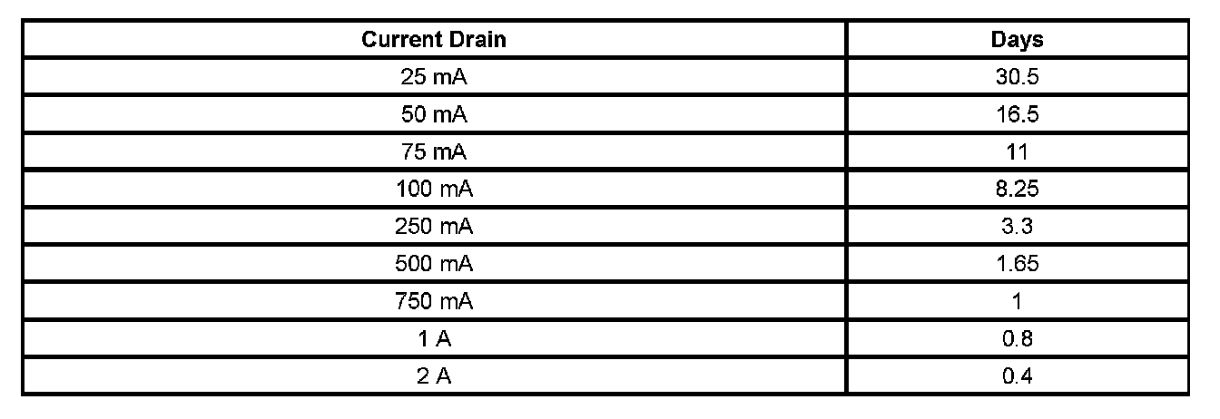 * The battery run down time will vary depending on cold cranking amperage (CCA) and reserve capacity (RC). If the CCA and RC are higher, then the battery run down time would be longer. If the CCA and RC are lower, then the battery run down time would be shorter. The graph below indicates roughly how many days a 690 CCA battery with at 110 min. RC (60.5 AH) starting at 80 percent state of charge will last with a constant current draw until it reaches 50 percent state of charge. Differences in battery rating and temperature will affect the results.