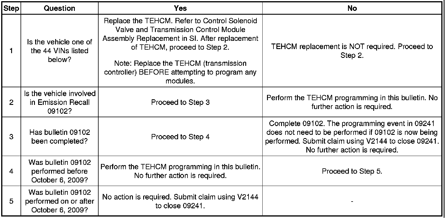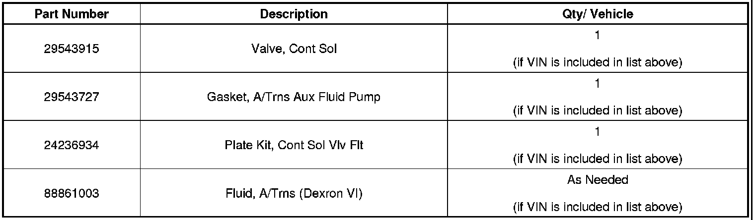 No parts are required for the majority of vehicles. 44 vehicles will require replacement of the control solenoid valve (transmission controller) (see list below for listing of vehicles). Assemblies required to complete this program are to be obtained from General Motors Customer Care and Aftersales (GMCC&A). Please refer to your "involved vehicles listing" before ordering parts. Normal orders should be placed on a DRO = Daily Replenishment Order. In an emergency situation, parts should be ordered on a CSO = Customer Special Order.