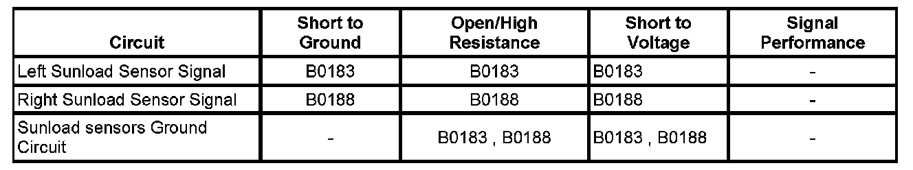 The following DTCs are for the left and right sunload sensors.