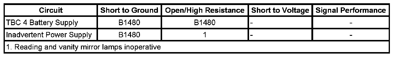 * The inadvertent power supply voltage circuit to the reading and vanity mirror lamps is shorted to ground.