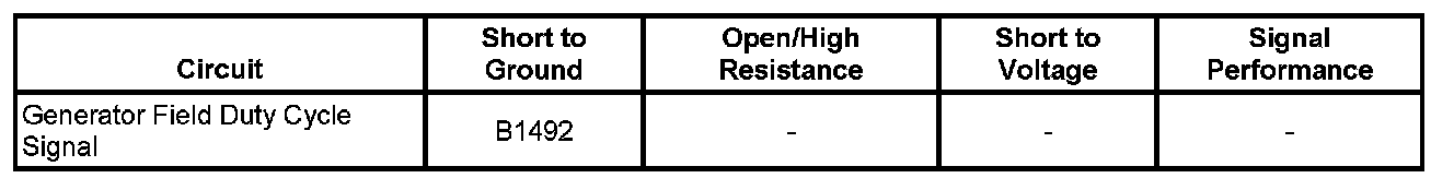 The generator battery control module (GBCM) monitors the generator through the generator field duty cycle signal circuit. The signal is a pulse width modulation (PWM) signal of 128 Hz with a duty cycle of 0-100 percent. Normal duty cycle is between 5-95 percent. If the generator field duty cycle signal circuit is in the 0-5 percent range or pulled low to ground, then DTC B1492 will set.