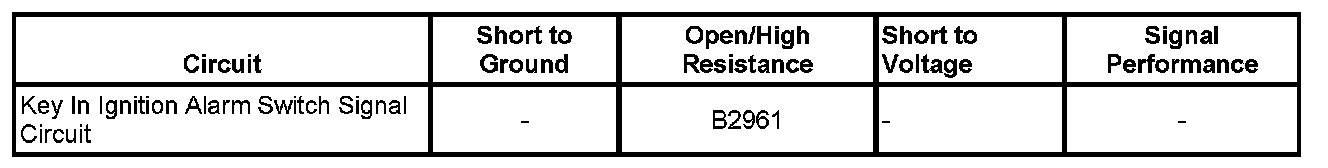 The body control module (BCM) monitors the ignition key alarm switch. When the key is in the ignition, the ignition key alarm switch is closed and the signal circuit is low. When the key is not in the ignition, the ignition key alarm switch is open and the signal circuit is high.