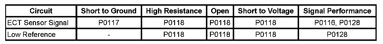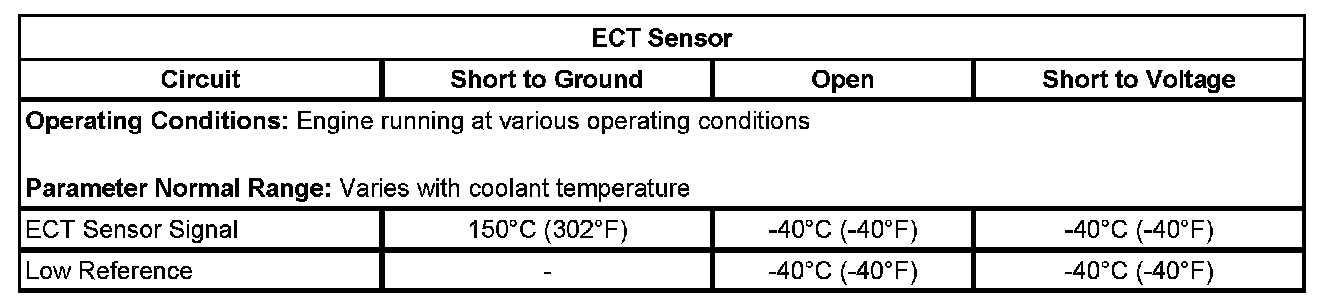 The ECM detects that the ECT is colder than -39°C (-38°F) for greater than 5 seconds.