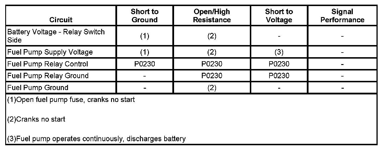 The control module monitors the voltage on the fuel pump relay control circuit. If the control module detects an incorrect voltage on the fuel pump relay control circuit, a fuel pump relay control DTC sets.