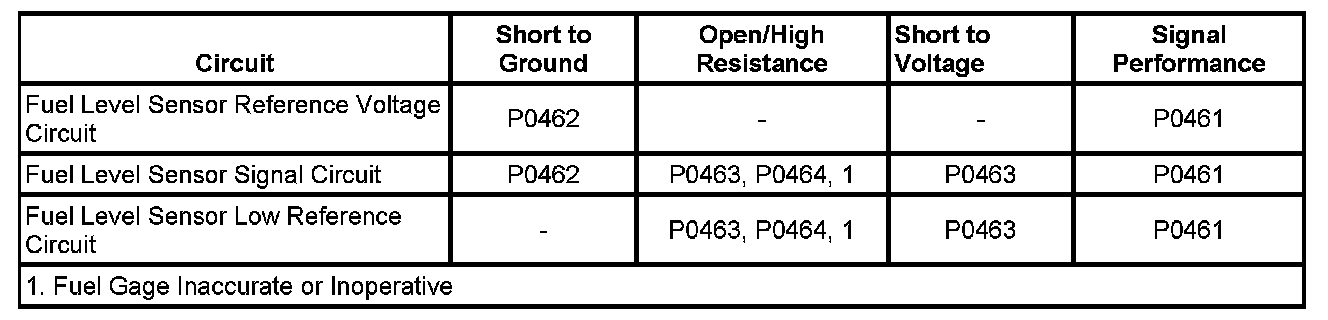 The engine control module (ECM)/powertrain control module (PCM) monitors the signal circuit of the fuel level sender in order to determine fuel level. The sender consists of a variable resistor that changes resistance based on the fuel level in the tank. The ECM/PCM monitors the voltage across the sender resistance in order to determine the fuel level. The ECM/PCM uses the signal circuit of the fuel level sender in order to calculate the total remaining fuel, in percent. The ECM/PCM sends the fuel level percent via the serial data circuit to the instrument cluster in order to control the fuel gage. The fuel level information is also used for misfire and evaporative emission (EVAP) diagnostics.