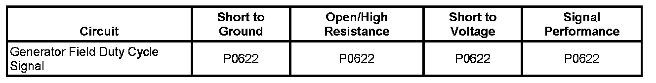 The engine control module (ECM) uses the generator field duty cycle signal circuit, or F-terminal circuit, to monitor the duty cycle of the generator. The generator field duty cycle signal circuit connects to high side of the field windings in the generator. A pulse width modulated (PWM) high side driver in the voltage regulator turns the field windings ON and OFF. The ECM uses the PWM signal input to determine the generator load on the engine. This allows the ECM to adjust the idle speed to compensate for high electrical loads. The ECM monitors the status of the generator field duty cycle signal circuit. When the key is in the RUN position and the engine is OFF, the ECM should detect a duty cycle near 0 percent. However, when the engine is running, the duty cycle should be between 5-95 percent.