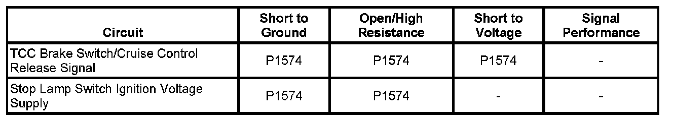 This diagnostic test functions on the assumption that a sudden decrease in vehicle speed is caused by a brake pedal application. When the engine control module (ECM) detects that there is a 4.2 km/h (2.6 mph) or greater decrease in vehicle speed within 0.25 second and a transition of the torque converter clutch (TCC) brake switch circuit without a transition of the stop lamp switch circuit, the ECM sets DTC P1574.