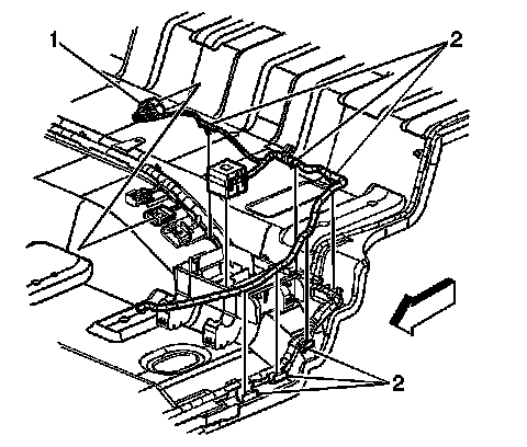 17. Remove the headliner harness retaining clips (2) from the rocker panel and floor panel.