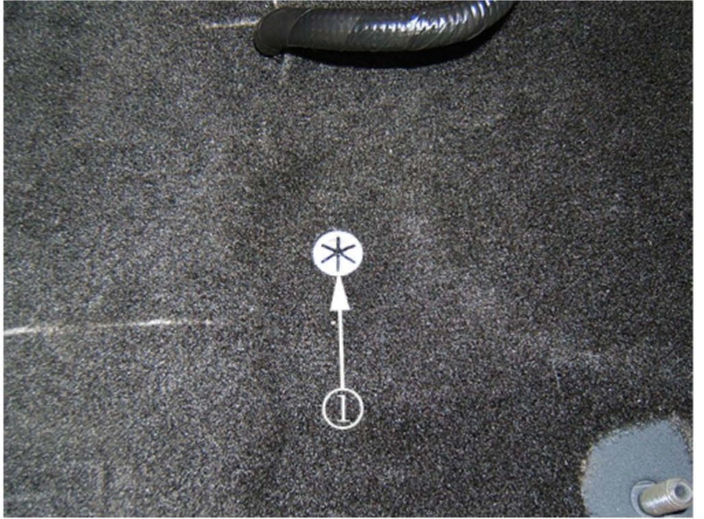 Lift the right side carpet assembly up while positioning the deadener (1) between the carpet and the top front center of the floor pan tunnel.