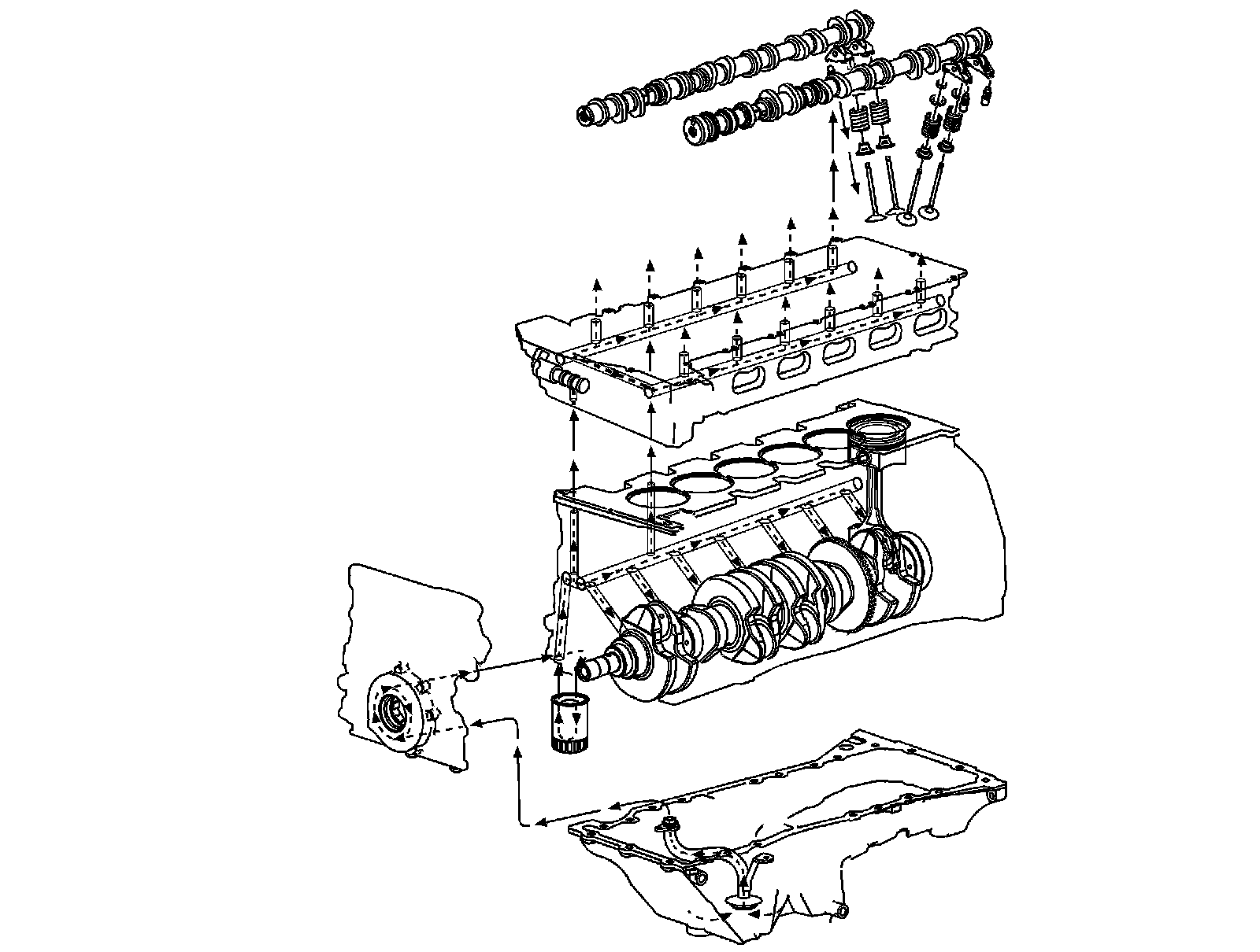 The engine lubrication system is of the force-feed type. The oil is supplied under full pressure to the crankshaft, connecting rods, valve lash adjusters, and cam phasing system. A controlled volume of oil is supplied to the camshaft and valve rocker arms. Gravity flow or splash lubricates all other parts. The engine oil is stored in the oil pan, which is filled through a fill cap in the camshaft cover. A removable oil level indicator, on the right side of the engine block, is provided to check the oil level. The oil pump is located in the engine front cover and is driven by the crankshaft. It is a gerotor-style pump, which is a combination of a gear, and a rotor pump. It is connected by a passage in the cylinder block to an oil screen and pipe assembly. The screen is submerged in the oil supply and has ample volume for all operating conditions. Oil is drawn into the pump through the screen and pipe assembly, and a passage in the crankcase, connecting to the passages in the engine front cover. Oil is discharged from the oil pump to the oil filter. The oil pressure relief valve limits the oil pressure. The oil filter bypass valve opens when the oil filter is restricted to approximately 68.95 kPa (10 psi) of pressure difference between the oil filter inlet and discharge. The oil will then bypass the oil filter and channel unfiltered oil directly to the main oil galleries of the engine. A full-flow oil filter is mounted to the oil filter adapter on the lower right front side of the engine. The main oil galleries run the full length of the engine block and cut into the valve lash adjuster holes to supply oil at full pressure to the valve lash adjusters. Holes are drilled from the crankshaft bearings to the main oil gallery. Oil is transferred from the crankshaft bearings to the connecting rod bearings through holes drilled in the crankshaft. Pistons, piston pins, and cylinder walls are lubricated by oil splash from the crankshaft and connecting rods. The camshafts and valve rocker arms are supplied with oil from the oil passages drilled into the camshaft mounting areas.